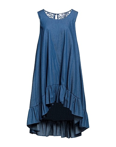 tela, pizzo, effetto denim, arricciato, brand logo, tinta unita, collo tondo, senza maniche, 1 bottone, elasticizzato, questo brand veste piccolo, vestito svasato