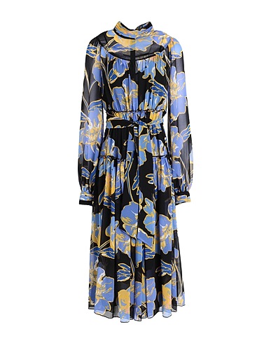 crêpe, ruches, cintura, fantasia floreale, collo alto, maniche lunghe, polsini con bottoni, sottoveste interna, zip, gancetti, modello a trapezio