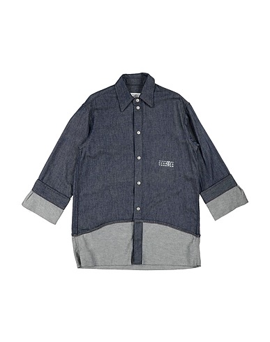 denim, tinta unita, brand logo, collo classico, lavaggio scuro, maniche lunghe, polsini con automatici, chiusura con bottoni automatici, senza tasche, lavare in lavatrice, non candeggiare, non asciugare in asciugatrice