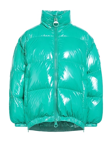 tessuto tecnico, senza applicazioni, tinta unita, collo alto, monopetto, maniche lunghe, interno in piuma d'oca, zip, multitasche, contiene parti non tessili di origine animale, modello monopetto