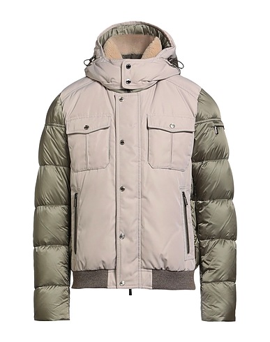 piumino corto, tessuto tecnico, trapuntato, bicolore, brand logo, finiture in shearling, collo con cappuccio, monopetto, maniche lunghe, interno in piuma d'oca, chiusura con zip, chiusura con bottoni nascosti, tasche con zip, taschino doppio, contiene parti non tessili di origine animale, lavare a secco, non candeggiare, non asciugare in asciugatrice