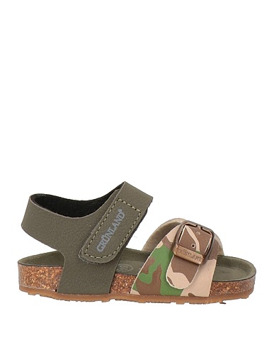 tessuto spalmato, brand logo, fantasia mimetica, interno in tessuto, chiusura con velcro, punta tonda, senza tacco, suola in gomma con incisioni, sandali aperti