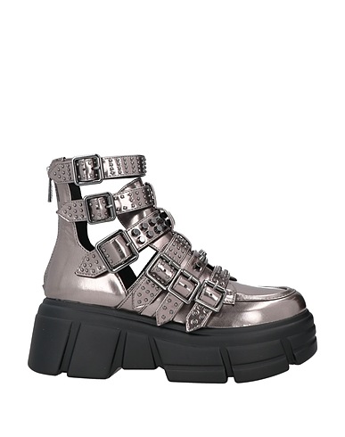 tessuto spalmato, effetto laminato, borchie, tinta unita con applicazioni, interno foderato, zip, chiusura con fibbia, punta tonda, tacco squadrato, suola in gomma con incisioni, chunky boots