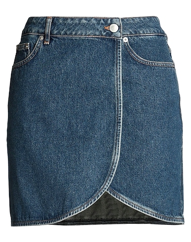 denim, effetto delave, senza applicazioni, tinta unita, lavaggio medio, vita con passanti, chiusura con bottoni, cinque tasche, gonna a portafoglio