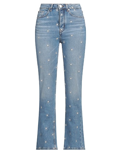 jeans svasati, denim, effetto delave, tinta unita con applicazioni, ricamato, lavaggio medio, vita alta, vita con passanti, slim fit, chiusura con bottoni, tasche, lavare in lavatrice o a secco, non candeggiare, non asciugare in asciugatrice