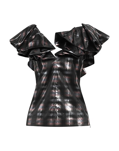 フリル付きトップス / クレープ素材 / メタリック加工 / フリル付き / タータンチェック柄 / 深く開いたネックライン / ノースリーブ / 裏地あり / ポケットなし / ドライクリーニングできます / 漂白剤使用不可 / 乾燥機使用不可