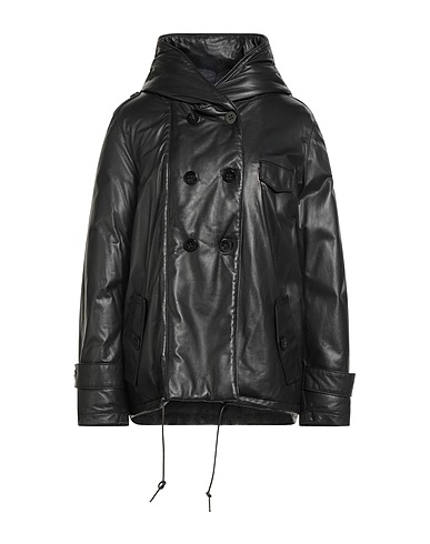 ダブルブレストコート / レザー / 装飾なし / 無地 / フード付きネック / 長袖 / 中綿グースダウン / ライトパディング / ファスナーで開閉 / ボタンで開閉 / ポケット複数あり / 繊維でない動物性素材使用 / 専門業者によるクリーニングまたはドライクリーニング / 乾燥機使用不可