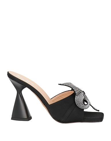 サテン素材 / リボンあり / ラインストーン付き / 無地(装飾付き) / 裏面: レザー / スクエアトゥ / 砂時計型ヒール / ラバーソール / 繊維でない動物性素材使用 / スライドサンダル
