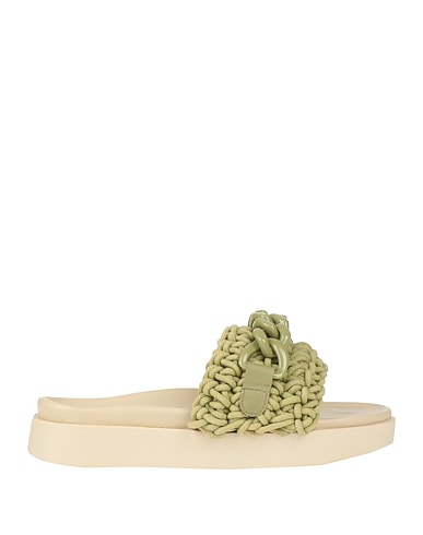 ニット素材 / コントラストになった装飾あり / 無地(装飾付き) / 裏面: レザー / ラウンドトゥ / フラット(ヒールなし) / 溝入りラバーソール / 繊維でない動物性素材使用 / スライドサンダル