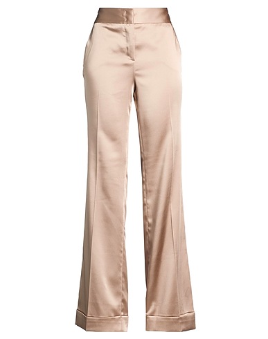 サテン素材 / 装飾なし / 無地 / ハイウエスト / ワイドレッグ / コンフォートフィット / ファスナー付き / カギホック開閉 / ダブル(折り返し)スタイルの裾 / ポケット複数あり / テーラードパンツ / 小さめのサイズ感