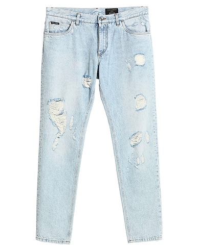 テーパード ジーンズ / デニム素材 / ディストレスド加工 / 無地 / ブランドロゴ / レザーの挿入装飾 / ライトウォッシュ / レギュラーフィット / ポケット5つ / 繊維でない動物性素材使用 / クロップド