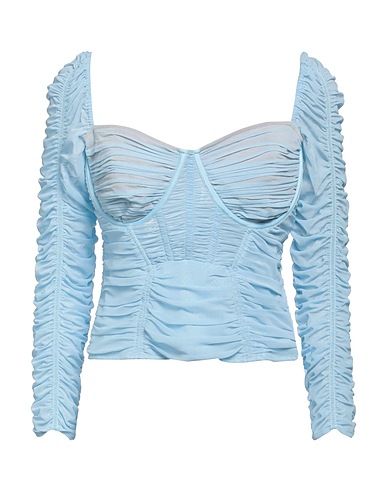 탑, 튤, 솔리드 컬러, 개더 디테일, 딥 네크라인, 롱 슬리브, 지퍼 여밈, 스트레치, 드라이클리닝, 표백 금지, 건조기 사용불가