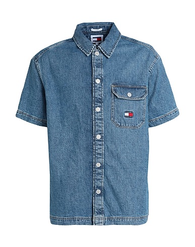 데님, 바랜 효과, 브랜드 로고, 솔리드 컬러, 미디엄 워싱, 클래식 칼라, 쇼트 슬리브, 스냅버튼 여밈, 싱글 포켓