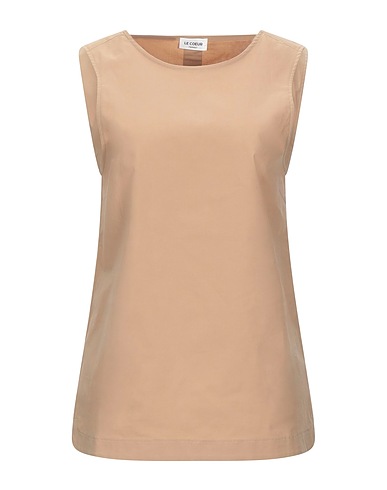 탑, 우븐, 스트레치 패브릭, 솔리드 컬러, 브랜드 로고, 크루넥, 슬리브리스, 버튼 여밈