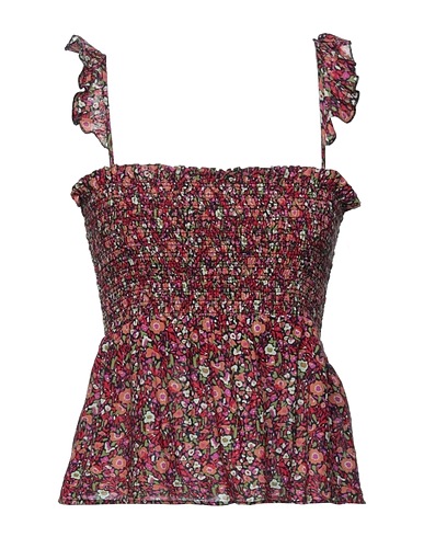 탑, 우븐, 플로럴 모티브, 개더 디테일, 스퀘어 네크라인, 슬리브리스