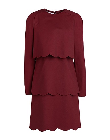크레이프, 러플, 솔리드 컬러, 라운드 네크라인, 롱 슬리브, 안감있음, 지퍼 클로저, 포켓 없음, 트라페즈 스커트