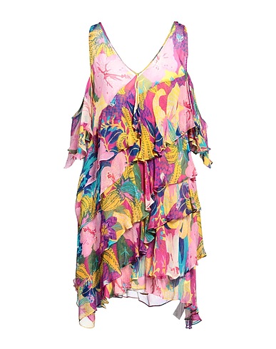 크레이프, 티어드, 멀티컬러 패턴, 플로럴 모티브, 딥 네크라인, 쇼트 슬리브, 슬립 내장, 포켓 없음, 원피스 & 드레스