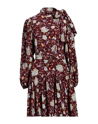 플레어 드레스, 새틴, 플로럴 모티브, 벨트, 보우 타이 네크라인, 롱 슬리브, 안감없음, 버튼 여밈, 포켓 없음, 드라이클리닝