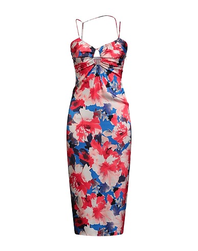 플레어 드레스, 새틴, 스트레치 패브릭, 플로럴 모티브, 장식 부착 없음, 홀터넥, 슬리브리스, 안감없음, 포켓 없음, 드라이클리닝, 표백 금지, 건조기 사용불가, 결혼식 하객 스타일로도 적합한 특별한 날에 어울리는 우아한 세레모니 룩