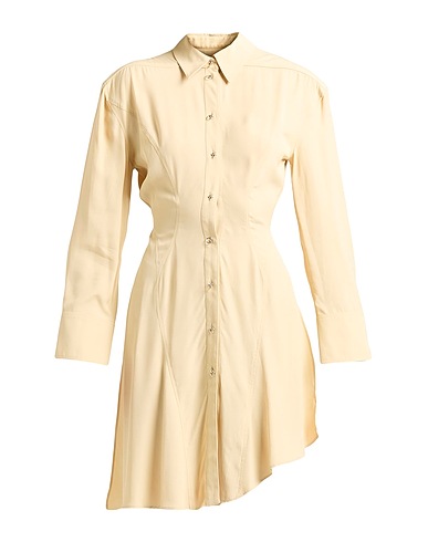 셔츠 드레스, 크레이프, 솔리드 컬러, 컷아웃 효과, 클래식 칼라, 롱 슬리브, 어깨 패드, 버튼 커프스, 버튼 여밈, 백 슬릿, 비대칭 헴, 손세탁 또는 드라이클리닝, 표백 금지, 건조기 사용불가
