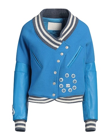 바시티 자켓, 가죽, 보일드 울, 멀티컬러 패턴, 브랜드 로고, 와이드 네크라인, 싱글브레스티드, 롱 슬리브, 안감있음, 스냅버튼 여밈, 동물성 비섬유 자재 함유, 드라이클리닝 금지, 표백 금지, 건조기 사용불가
