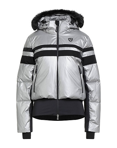 쇼트 패딩 자켓, 테크니컬 패브릭, 저지, 메탈릭 효과, 브랜드 로고, 플러시 패브릭 트리밍, 투톤 패턴, 목 부분의 분리 가능한 후드, 롱 슬리브, 썸 홀 커프스, 합성 충전재, 헤비 패딩, 세탁기로 세탁, 표백 금지, 건조기 사용불가, 다림질 금지