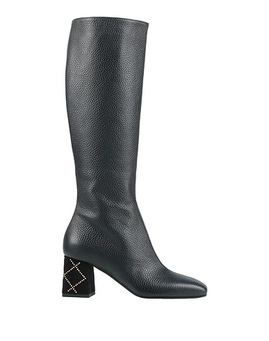 텍스쳐드 가죽, 브랜드 로고, 솔리드 컬러, 가죽 소재의 내부, 지퍼 여밈, 스퀘어 토, 스퀘어 힐, 커버드 힐, 고무 밑창, 동물성 비섬유 자재 함유, 부츠