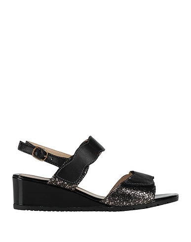 앵클 스트랩 샌들, 페이턴트 가죽, 솔리드 컬러, 장식 부착 없음, 가죽 소재의 내부, 벨크로 여밈, 라운드 토, 웨지 힐, 미끄럼방지 고무 밑창, 동물성 비섬유 자재 함유