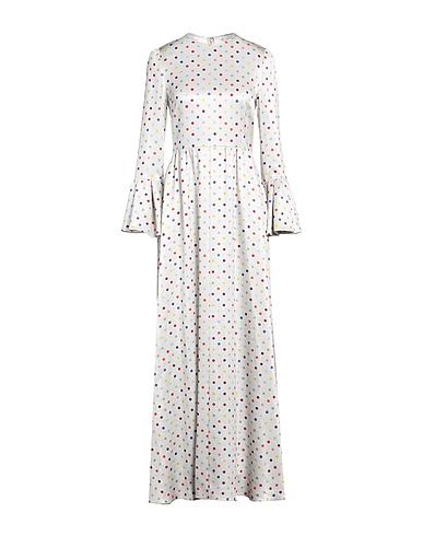 크레이프, 라미네이트 효과, 장식 부착 없음, 폴카도트, 라운드 네크라인, 롱 슬리브, 포켓 없음, 뒤여밈, 훅&아이, 지퍼여밈, 안감없음, 트라페즈 스커트