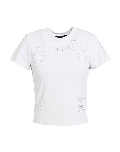 sports top, synthetic jersey, perforated, solid color, brand logo, crewneck, short sleeves, stretch, machine wash or dry clean, do not bleach, do not tumble dry