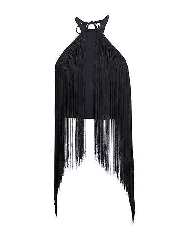off-the-shoulder top, crepe, solid color with appliqués, fringes, sleeveless, zipper fastening, tie fastening, stretch, dry clean, do not bleach, do not tumble dry