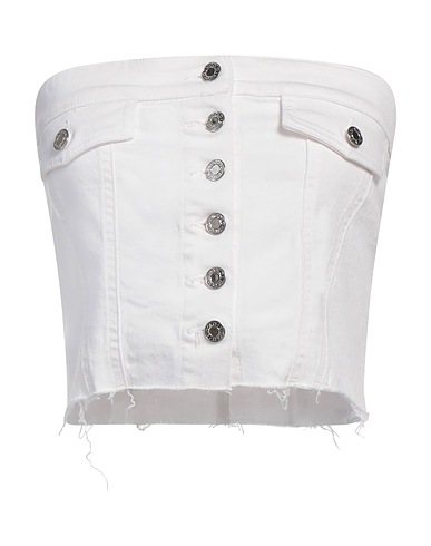 tube top, denim, stretchy fabric, solid color, no appliqués, off-the-shoulder, button fastenings, fringed hem, machine wash or dry clean, do not bleach, do not tumble dry