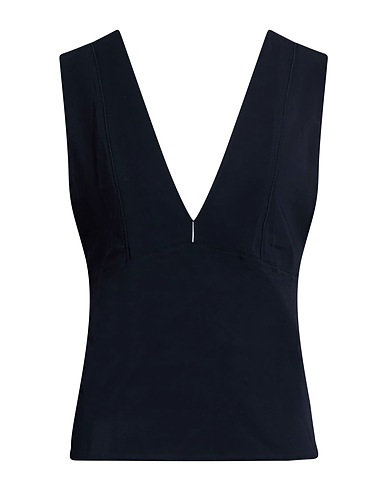 top, crepe, solid color, no appliqués, deep neckline, sleeveless, stretch, dry clean, do not bleach, do not tumble dry, this brand runs large