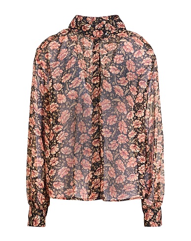 shirt, crepe, metallic, floral-print, brand logo, mock neck, long sleeves, concealed button fastenings, hand wash or dry clean, do not bleach, do not tumble dry