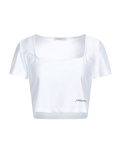 crop tee, synthetic jersey, stretchy fabric, solid color, brand logo, square neckline, short sleeves, machine wash or dry clean, do not bleach, do not tumble dry