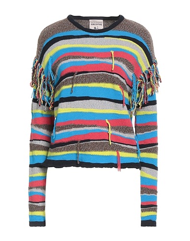 knitted, medium-weight knit, striped, fringes, crewneck, long sleeves, dry clean, do not bleach, do not tumble dry