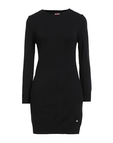 bodycon dress, knitted, lightweight knit, solid color, brand logo, crewneck, long sleeves, unlined, machine wash, do not bleach, do not tumble dry
