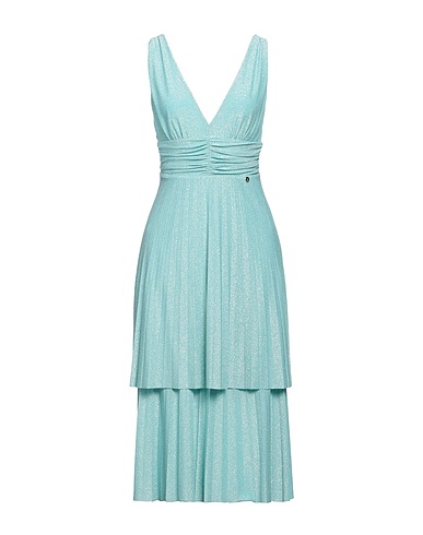 pleated dress, knitted, lightweight knit, metallic, stretchy fabric, solid color, brand logo, gathered, deep neckline, sleeveless, fully lined, zipper fastening, hook fastenings, dry clean, do not bleach, do not tumble dry