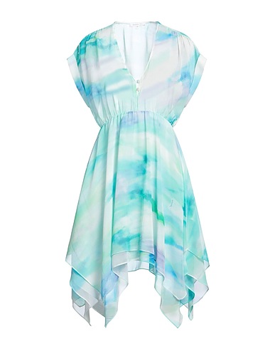asymmetric dress, chiffon, tie-dyed, gathered, brand logo, buttoned neckline, short sleeves, shoulder pads, without pockets, hand wash or dry clean, do not bleach, do not tumble dry