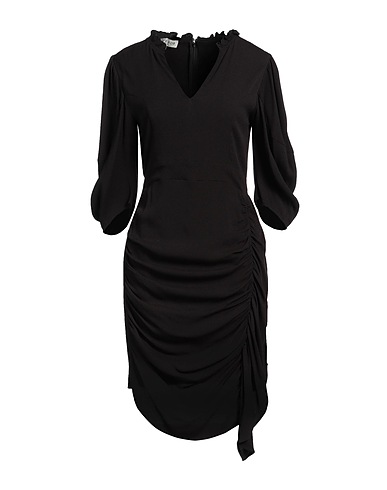 bodycon dress, crepe, solid color, draped, ruffles, v-neck, 3/4 length sleeves, partially lined, hook fastenings, zipper fastening, without pockets, asymmetric hem, hand wash or dry clean, do not tumble dry