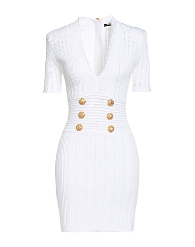 knitted, lightweight knit, button-embellished, solid color with appliqués, deep neckline, short sleeves, shoulder pads, unlined, zipper fastening, without pockets, dry clean, do not bleach, do not tumble dry, bodycon dress
