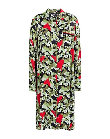 shirt dress, satin, camouflage-print, no appliqués, classic collar, long sleeves, unlined, button fastenings, one chest pocket, hand wash or dry clean, do not bleach, do not tumble dry