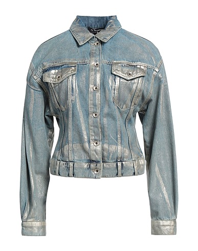 denim trucker jacket, denim, coated effect, metallic, no appliqués, solid color, medium wash, classic collar, long sleeves, buttoned cuffs, unlined, button fastenings, belt loops, one chest pocket, machine wash, do not bleach, do not tumble dry