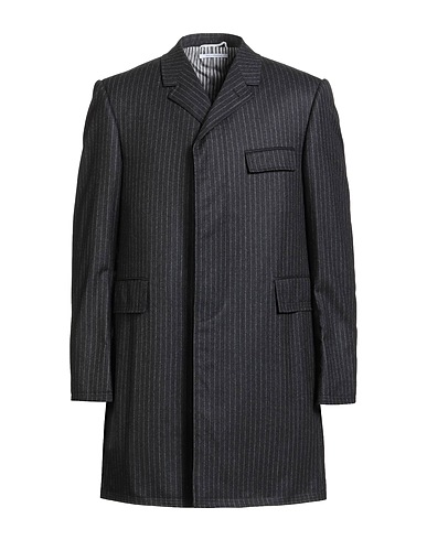 single-breasted coat, wool, flannel, pinstriped, brand logo, lapel collar, long sleeves, buttoned cuffs, fully lined, button fastenings, flap pockets, dual back vents, dry clean, do not bleach, do not tumble dry