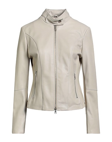 biker jacket, leather, jersey, no appliqués, solid color, mandarin collar, long sleeves, fully lined, zipper fastening, zipped pockets, contains non-textile parts of animal origin, do not wash, do not bleach, do not tumble dry, do not iron, this brand runs small