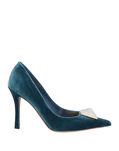 velvet, metal applications, crystals, solid color with appliqués, leather lining, pointed toe, stiletto heel, covered heel, leather sole, contains non-textile parts of animal origin, stilettos