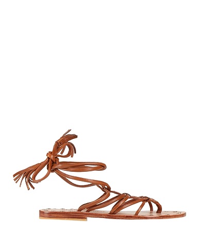 thong sandals, leather, solid color, tassels, studs, leather lining, ties at ankle, round toe, flat, rubber sole, contains non-textile parts of animal origin