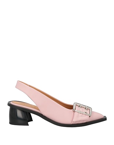 slingback pumps, coated fabric, solid color, brand logo, fabric inner, elasticized strap, square toe, square heel, rubber sole, small sized