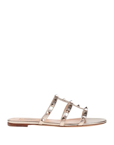sandals, leather, metallic, solid color with appliqués, studs, leather lining, round toe, flat, leather/rubber sole, contains non-textile parts of animal origin