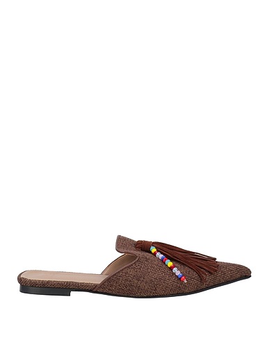mules, linen, leather, solid color with appliqués, beads, fringes, leather lining, pointed toe, flat, rubber sole, contains non-textile parts of animal origin